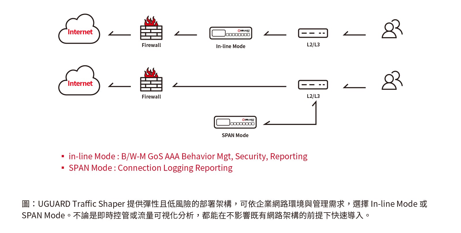 在部署上,Traffic Shaper 支援 Inline 與 SPAN 模式,可依既有網路架構彈性導入,並提供硬體式與軟體式 Bypass 設計,確保營運不中斷,協助企業建立更完善的網路使用管理架構。